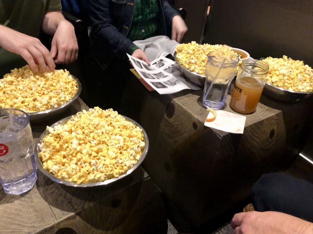 The nine-screen complex features luxury auditoriums with reclining loungers and slide-away tables. Seat-side servers deliver traditional movie favorites like soft drinks and bottomless popcorn, served homestyle in giant stainless steel bowls drizzled with real butter. A lengthy food menu offers a wide variety of burgers and pizzas, potato skins, BLT's, boneless and traditional wings, and Cobb salads.