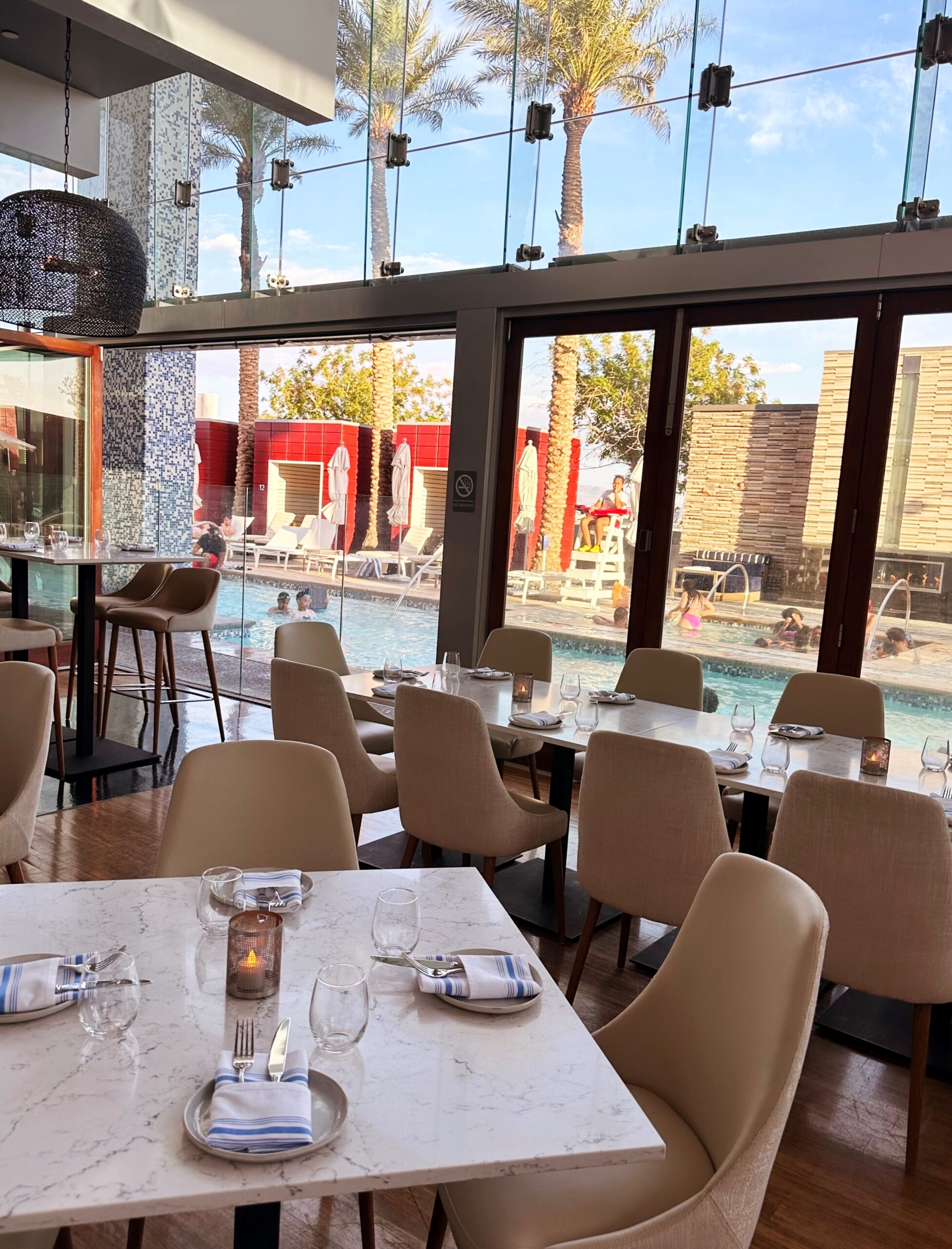 I think I’m ready to move into the new Laguna Pool House & Kitchen on the sixth floor of Palms Place. The setting, overlooking the pool, is airy and warmly elegant, designed with wood, stone, and glass. On a recent evening, our party arrived at 6:00pm (and stayed for three hours), a perfect time in the summer to bathe in the dining room’s beautiful light.