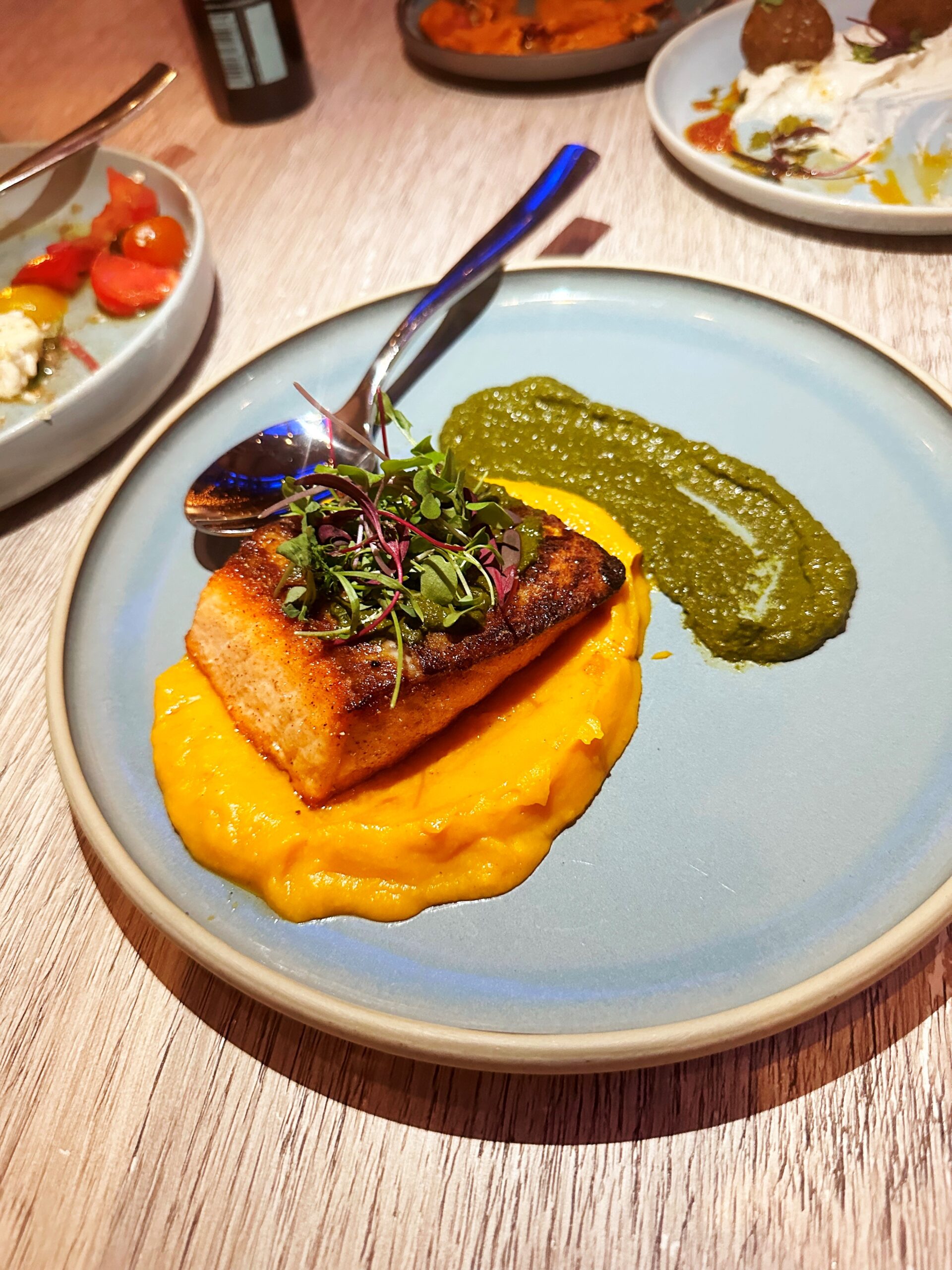 We started with pita and the creamy Muhammara spread with pomegranates, plus the soft, melt-in-your-mouth Green Chicken Pea Falafel, with Tahini Yogurt and Red Schug, and the Greek Salad with Pickled Onion and Marinated Feta. We shared the perfectly buttery Faroe Island Salmon with Roasted Pumpkin and Chermoula and marveled over the lemony Crispy Fingerling Potatoes with Kefalotyri Cheese, a true culinary smash.