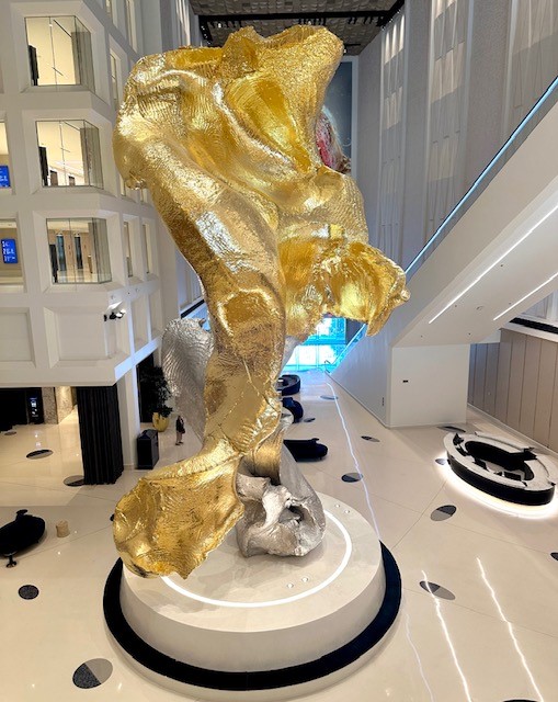 There’s lots of buzz about the giant sculpture in the Fontainebleau lobby—and its sheer size and dazzling abstract charisma totally enveloped me. In a recent profile about its artist, Urs Fischer, the New York Times described it as “…a craggy, otherworldly 46-foot-tall, 17-ton, gold-leaf and cast-aluminum abstract sculpture called ‘The Lovers #3,’ which suggests two asteroids from dueling solar systems locked in an embrace.”
