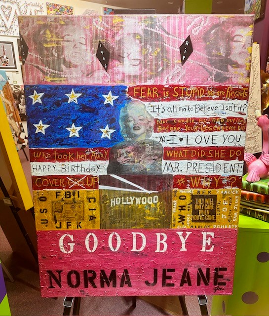 After dinner recently at El Dorado Cantina in Tivoli Village, we walked around and spotted this art piece in the window of Desert Valley Gallery. It pays tribute to June baby Marilyn Monroe and raises questions, if you look closely, about her mysterious death. “Who took her away…What did she do…Why?”