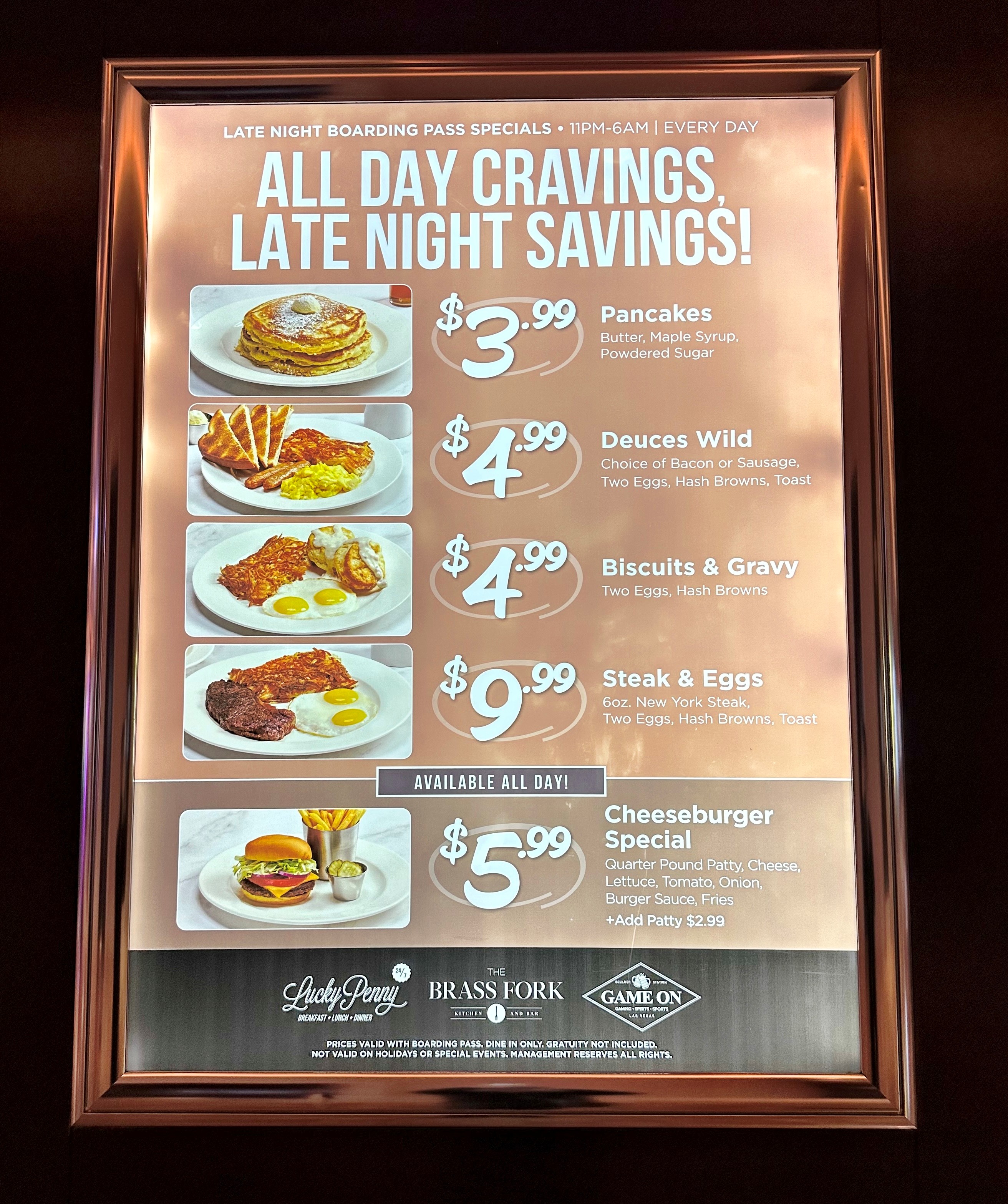 Feeling the pinch of rising prices? Fortunately, the good folks at Station Casinos have us covered with their 24/7 $5.99 Cheeseburger Special. I’m giving this deal a major thumbs-up having enjoyed it at Lucky Penny at Red Rock Resort, one of the Station restaurants (along with Brass Fork and Game On) where it’s offered. Simply show your player’s card, available for free at the hotel’s rewards desk, to receive the discount.