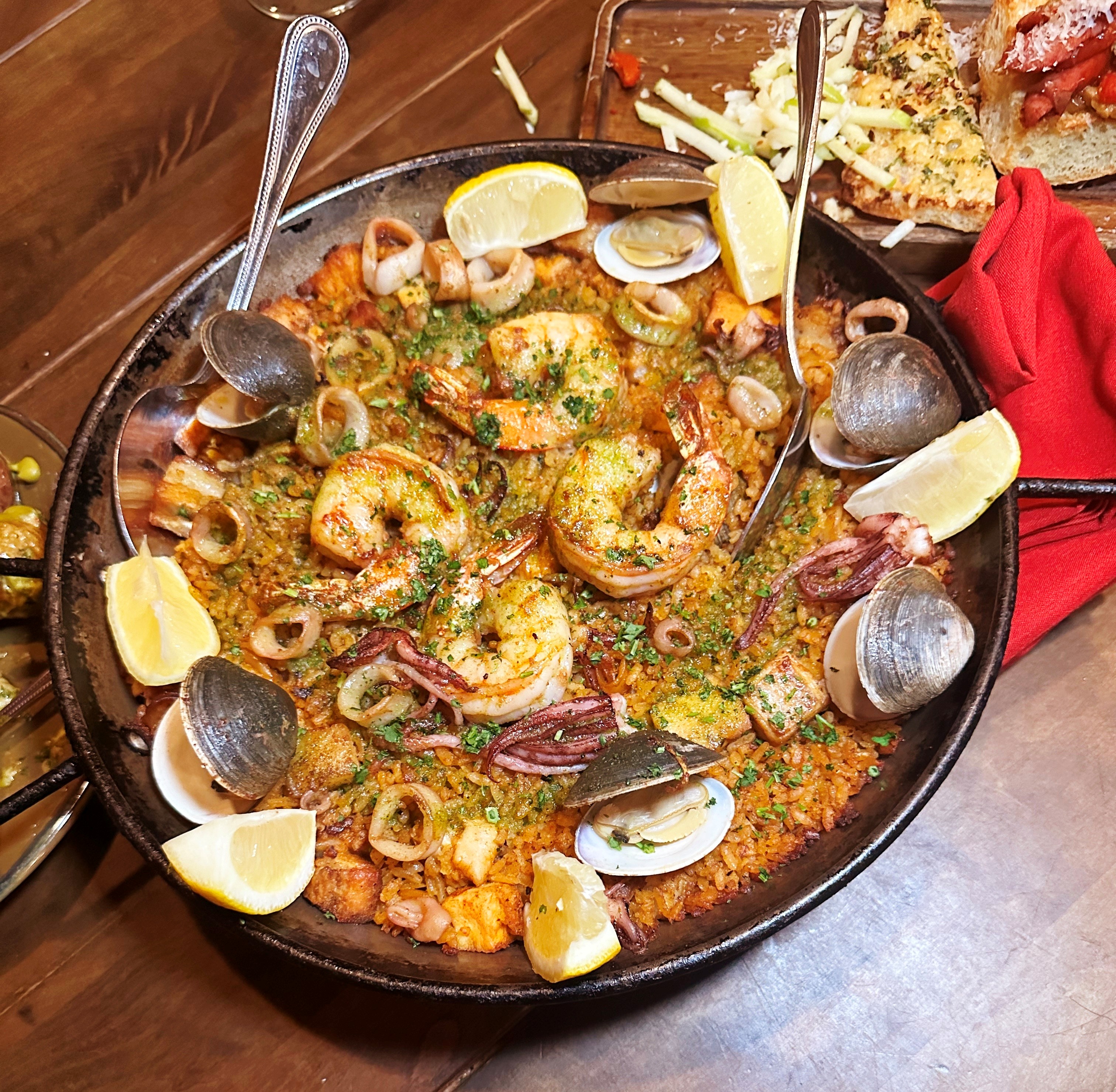 We led up to the paella with an outstanding Manchego cheese and green apple salad, enhanced with candied pecan, and two magical tapas: the patatas bravas—with pee wee potatoes, poblano aioli, and parsley—and another divine creation with roasted peppers, eggplant, red wine grapes, and Manchego cheese. Be sure to request Chinchilla’s seasoned house bread with your dinner because the taste is unforgettable.