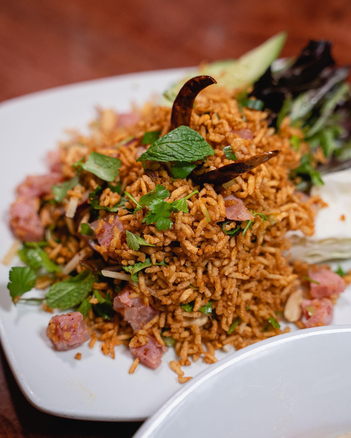 It also offers flavorful dishes like whole-fried sea bass, curry noodles, grilled Northern curry sausage, spicy pork, and fried red snapper with fish sauce.