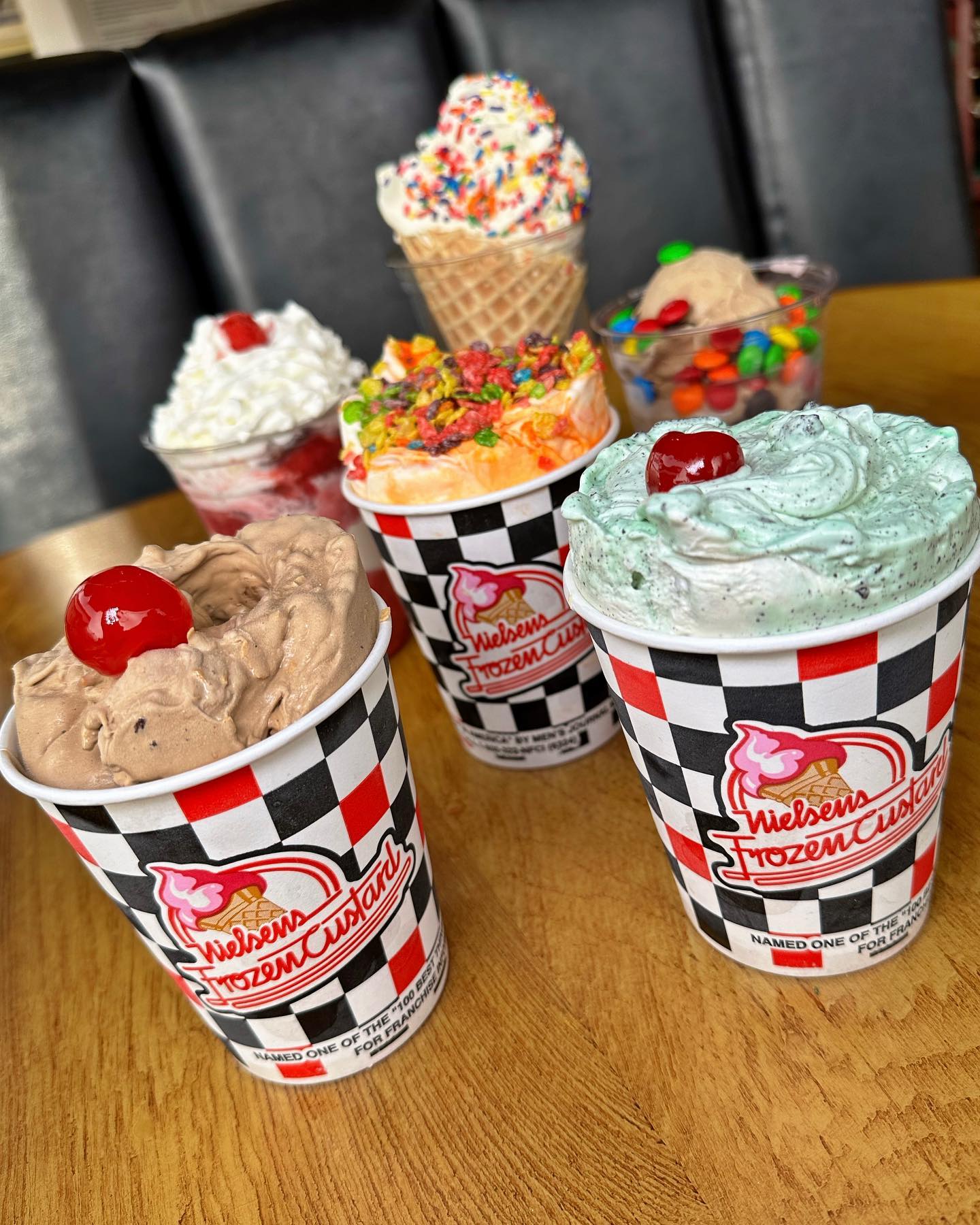 Nielsen’s Frozen Custard is a convenient quick eats spot specializing in 100% fresh frozen custards. The frozen custard is prepared using fresh ingredients like real dairy cream and eggs with no sweeteners or preservatives. The restaurant uses natural vanilla, breakfast-grade cocoas, freshly roasted nuts, and other natural ingredients to enrich its flavors. Each frozen custard is served at 26 degrees, ensuring you can sip it without freezing your taste buds. Some popular menu items at Nielsen’s Frozen Custard include: -