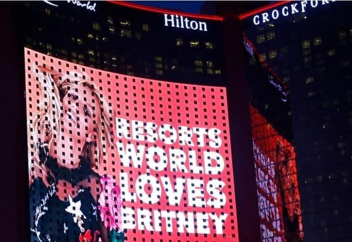 Resorts World has reportedly been trying to lure the troubled star into a comeback residency since July 2022. That's when the above graphic covered their building and could be seen throughout the city. But be careful what you wish for, especially with a spoiled, unbalanced pop star. Caesars learned that the hard way with Adele, whom we doubt has a stripper pole in her foyer.