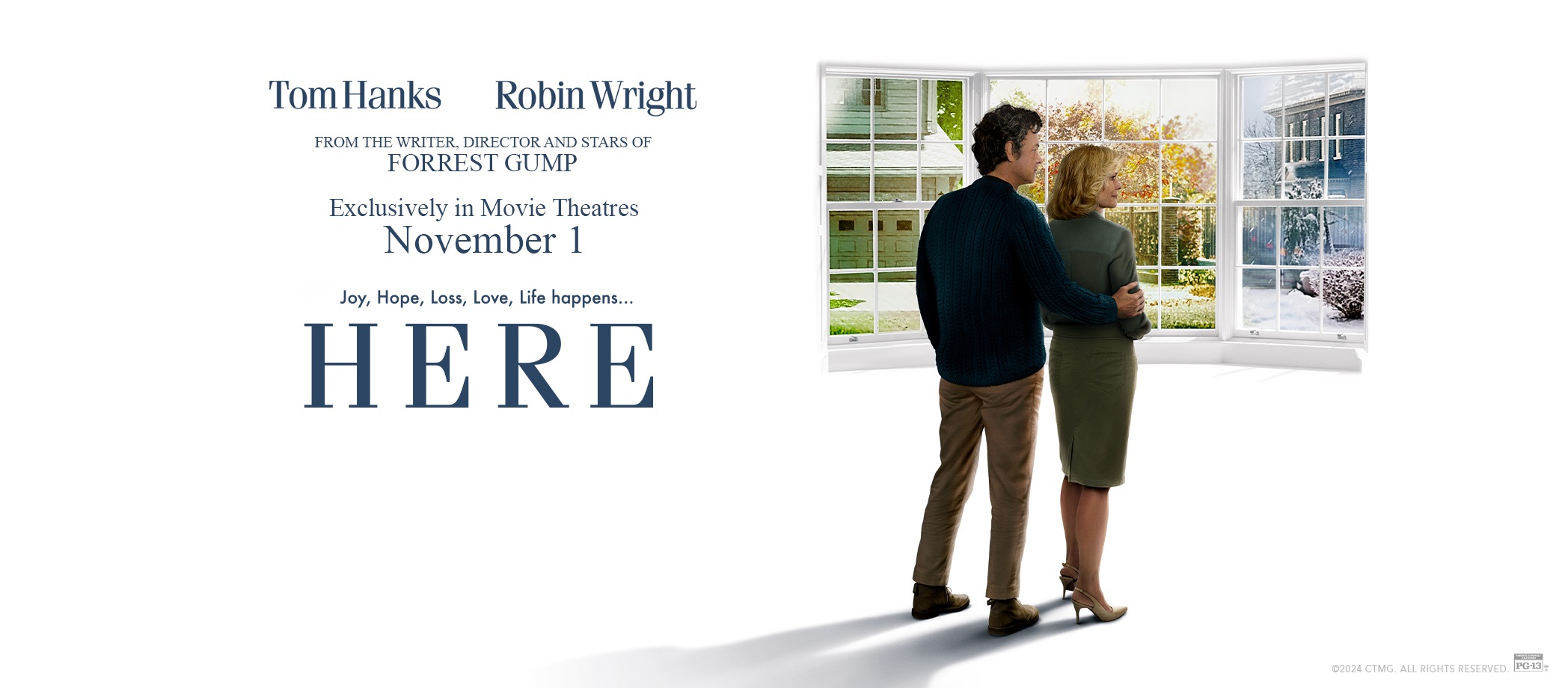 Here - An attempt to recapture the magic of Forrest Gump, HERE reteams director Robert Zemeckis with stars Tom Hanks and Robin Wright. The entire film takes place in one spot over millions of years from the same point of view. It's like watching life through a window on the other side of a room.