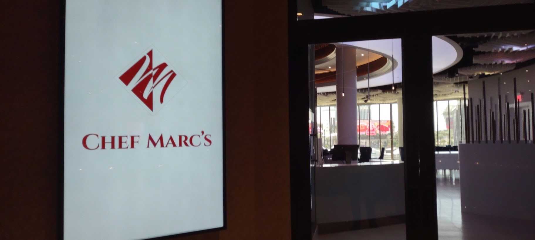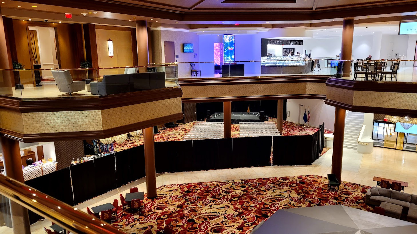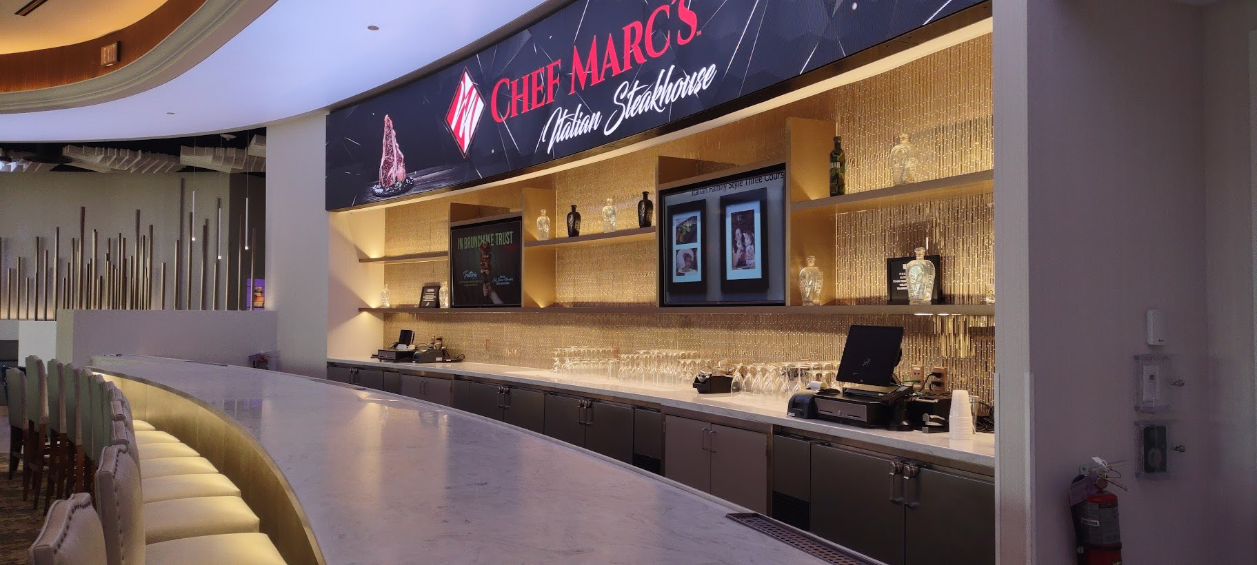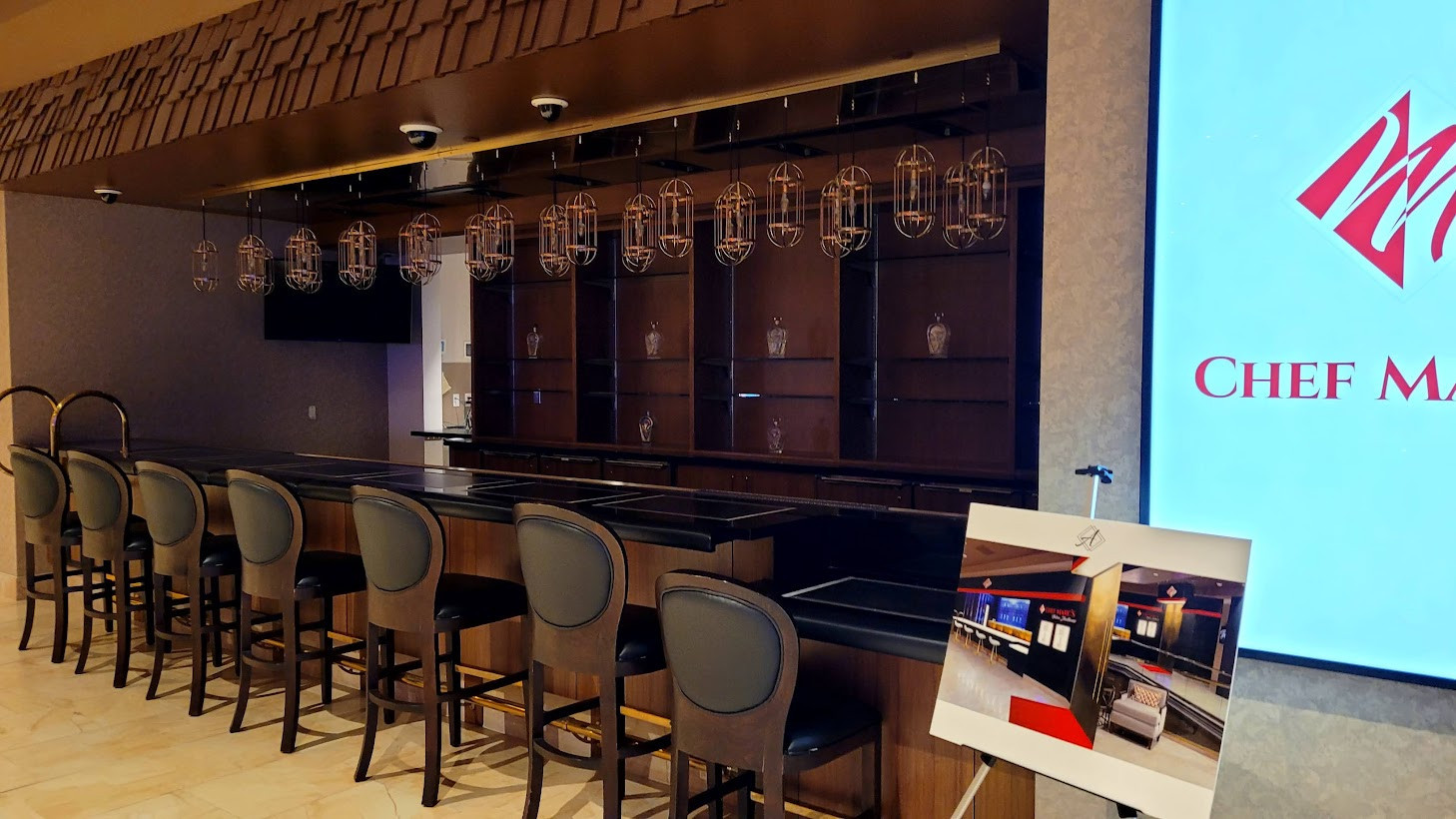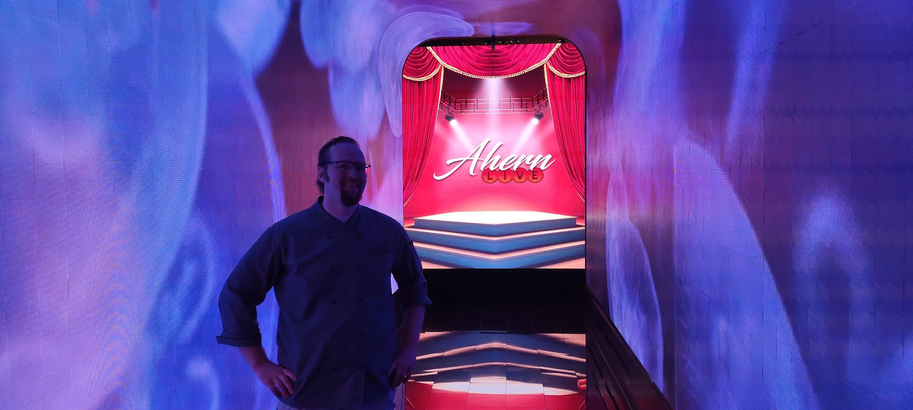 The next stop on Chef Joel's tour was AHERN LIVE, an intimate performance venue. Currently reserved for special events, the showroom is just waiting for the right act to launch an ongoing residency. Equipped with a full-service bar, more magnificent views, and luxurious seating, AHERN LIVE's showpiece is a high-tech video entrance. This tunnel-like corridor can be programmed to simulate any scenario from red-carpet paparazzi and patriotic fireworks to an under-the-ocean aquatic fantasy.