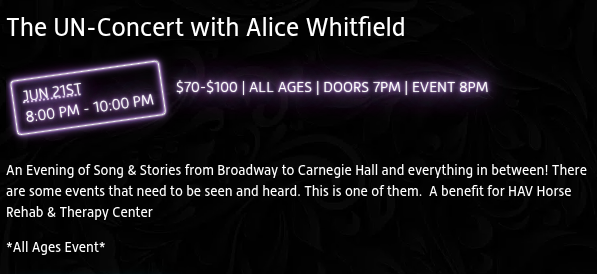 On June 21st, Alice Whitfield will return to the stage for a one-night fundraiser for HAV Horse Rehab & Therapy Center. It's called The UN-Concert With Alice Whitfield. Tickets start at $70 with an 8 pm showtime. The location is THE SPACE at 3460 Cavaretta Court, a stone's throw from Palms Casino. Get tickets here.