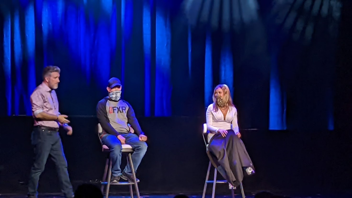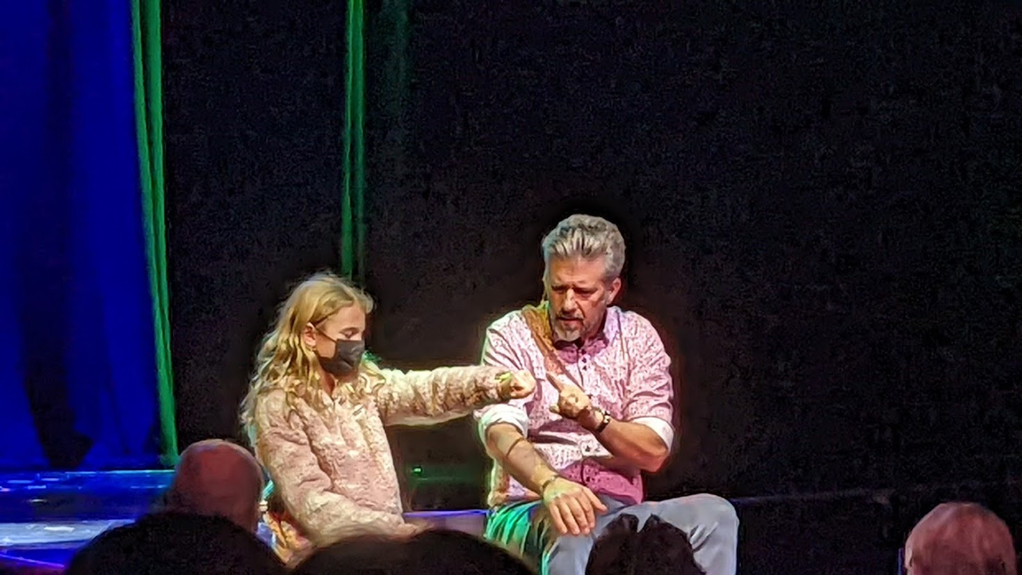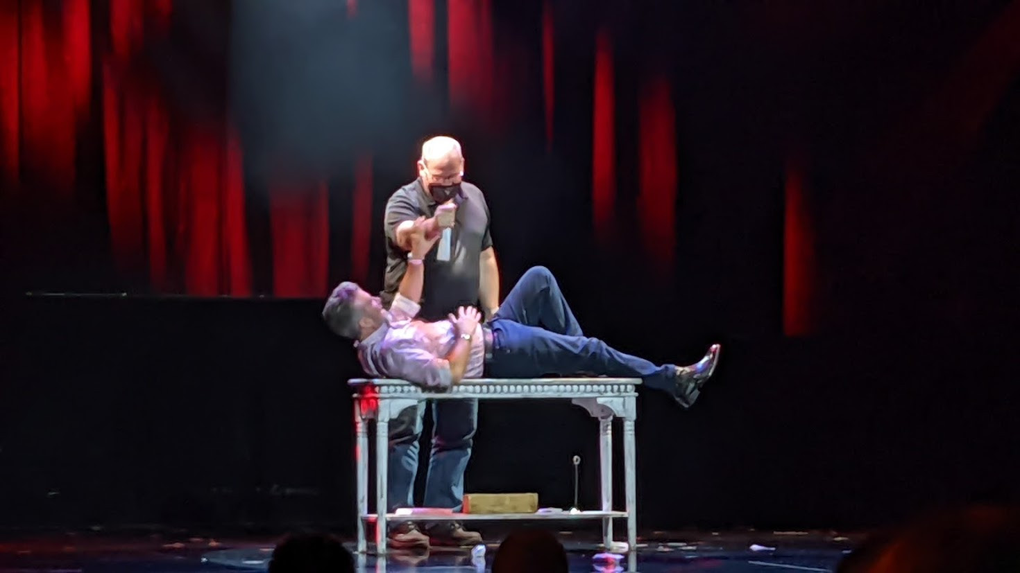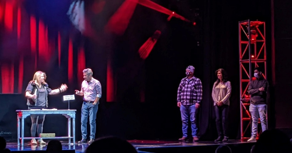 Next, he invites audience members to join him onstage, assuring everyone that none of them know each other, that nothing was prearranged, and that Banachek will pay you a hefty sum if you can prove otherwise. He touches the gentleman next to him...and the blindfolded lady a few feet away reacts. He instructs someone else to "stab" him, but you know that the participant already selected the knife without a sharp blade. And so it goes.