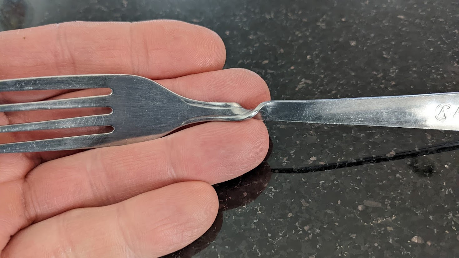 One sequence I truly enjoyed is a carryover from the Royal Resort show. A young girl was brought up to hold a supposedly-ordinary stainless steel fork. As she placed it in her palm and rubbed it with her finger, the fork bent and eventually twisted. This tried-and-true illusion is a classic that still boggles my mind. You see, I was the person holding the fork four years ago, know that it was solid steel, and witnessed its transformation. That fork is still in my silverware drawer...and I even use it from time to time.