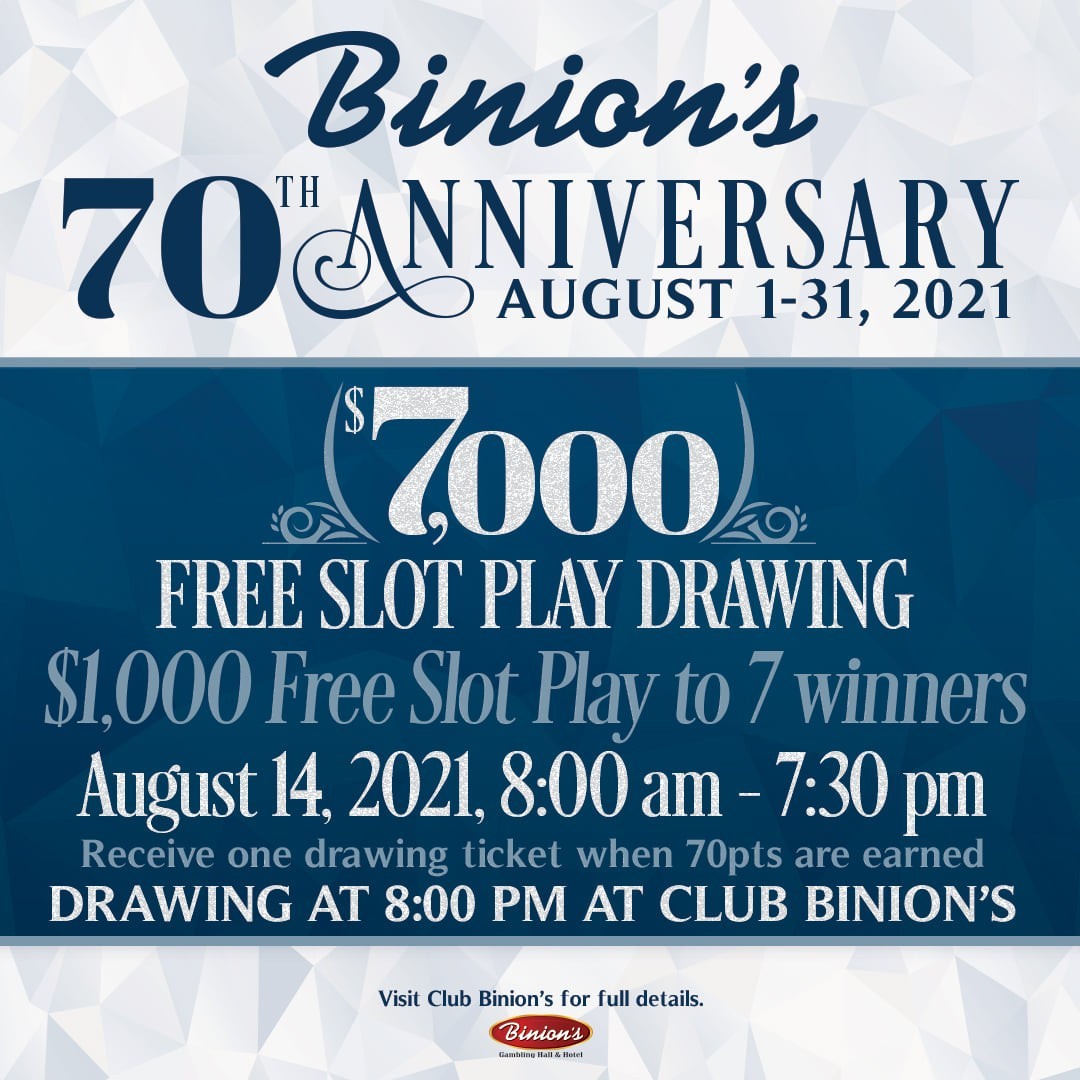 On August 14th, the casino will hold a $7.000.00 free slot play drawing, and the William Hill Sports Book at Binion's will participate in the Pro Pick 'Em contest for 2021's pro football season with $1,210,000 in cash prizes: