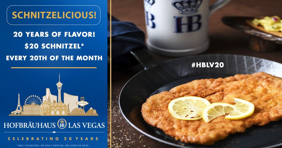 It's not too late to celebrate Oktoberfest at Hofbrauhaus Las Vegas. Celebrity keg-tappings take place on Friday and Saturday nights through the end of the month. In honor of its twentieth anniversary, the restaurant is offering $20 Schnitzel entrees on the 20th of every month.