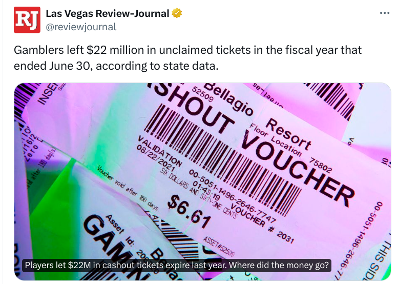 Las Vegas Review-Journal reported in June 2022 that Nevada gamblers left $22 million in unclaimed tickets behind for that fiscal year. Just like parking fees, that's a mountain of easy money. As with airline fees, don't expect this financial assault to end. Ever.