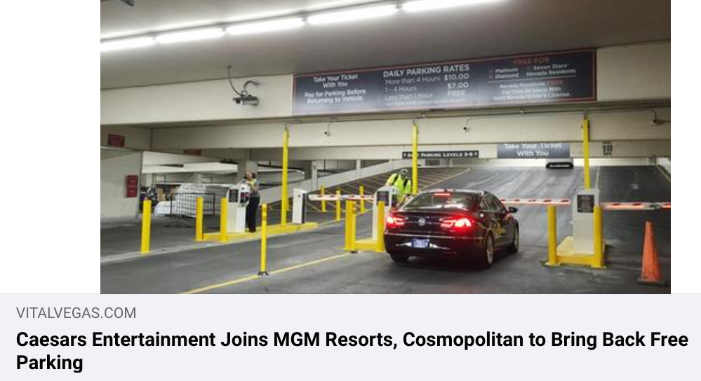The screenshot above is from an article published at VitalVegas.org. Our friend Scott Roeben was diligent in reporting the return of free parking to all of the major resorts that had been charging for it previously. It was the first sign that Las Vegas might return to being a generous, affordable destination.