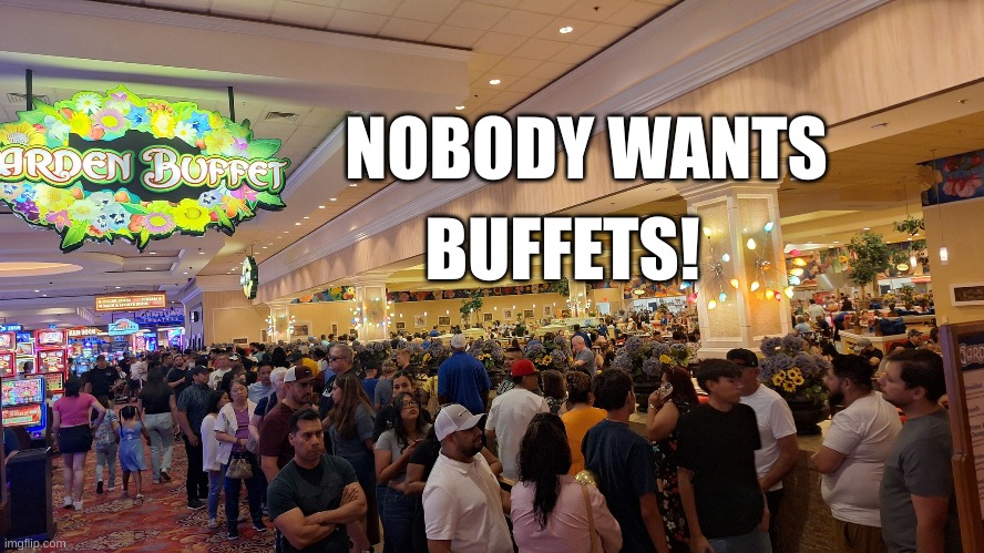 A blatant lie. Check out GARDEN BUFFET (above) at South Point Casino any time of any day. It'll be packed. The reason for the removal of all-you-can-eat restaurants is simple - they don't make as much profit as stand-alone establishments, take up more square footage, and require a lot of manpower and effort to operate.