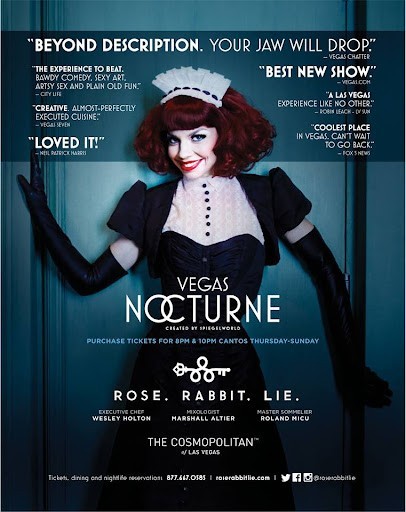2014's VEGAS NOCTURNE was part of a "grand social experiment" that included the adjacent restaurant Rose.Rabbit.Lie (now SUPERFRICO). An all-evening drinking/dining/entertainment/nightclub experience, VEGAS NOCTURNE was tough to summarize in concept and execution. Even actor Neil Patrick Harris botched the name when praising it on ELLEN.