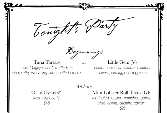 The Party's three-course dinner (above) is a collection of SUPERFRICO's biggest hits. Some selections come with an additional charge. Add your favorite wine, spirits, or mixed cocktails as The Party kicks into high gear. The beverage menu is available here.