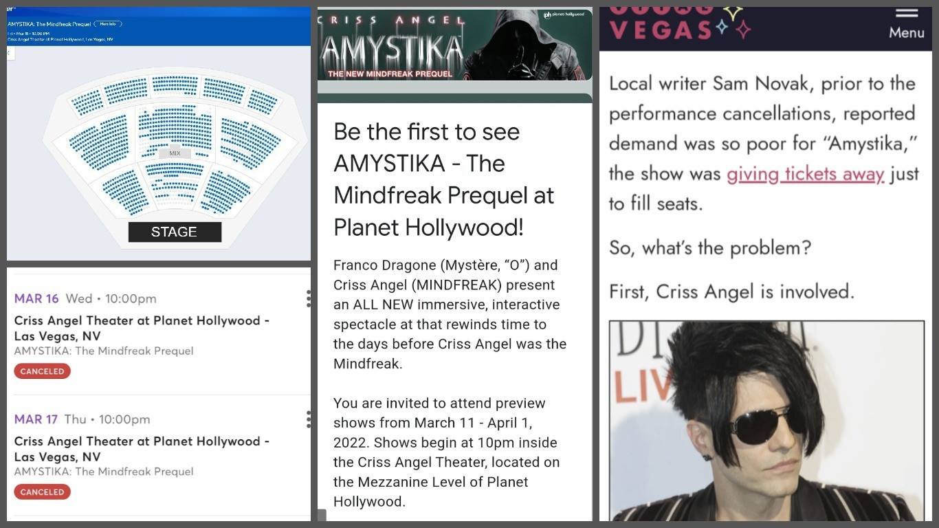 While the dozen or so fans who were disappointed at AMYSTIKA's second postponement cried into their Kool-Aid, those of us in the know, like Scott Roeben of VitalVegas.com, were quick to laugh about the obvious heaps of BS. The show was in desperate straits, but Nicky would never allow his ego to be deflated. So, he played the sympathy card by announcing on social media of being hospitalized with a groin injury. The following evening, Angel was reportedly just fine, out of the hospital, and dining at Al Solito Posto, an upscale Italian restaurant in Tivoli Village.