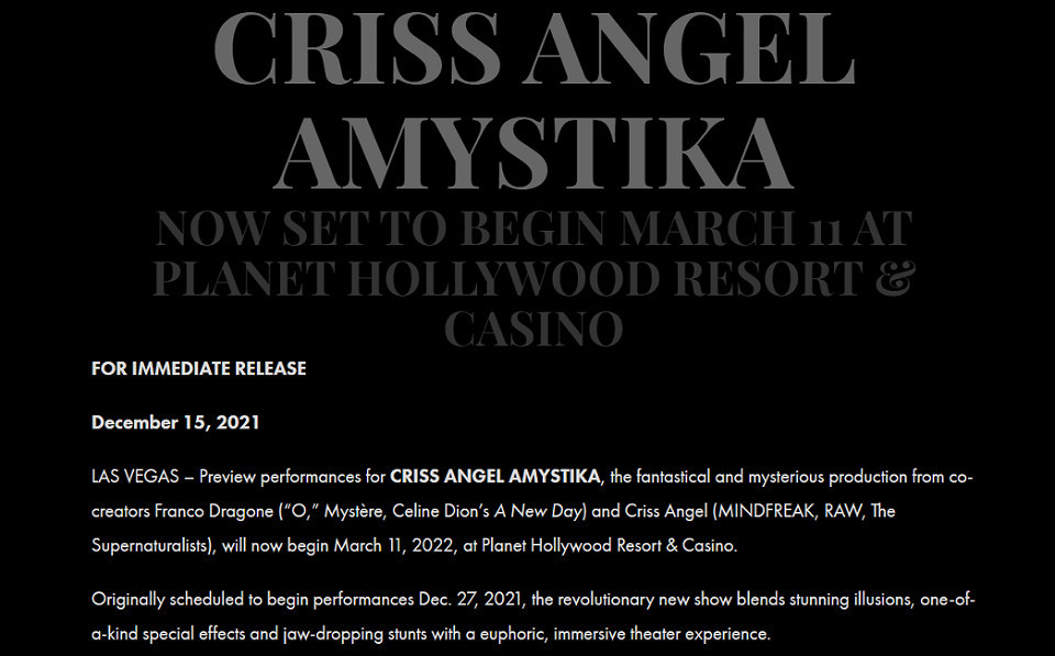So what exactly is AMYSTIKA? It appears to be Criss Angel's forgotten initial attempt to fuse his overblown illusions with the circus artistry of Cirque du Soleil. Franco Dragone is a former Cirque creator whose career has yielded Mystere, "O", and Le Reve. His fascination with the elements of fire and water, along with a penchant for dark characters, seems ideally suited for collaboration with Sin City's biggest windbag. What people seem to forget is that Nicky's last team-up with Cirque was BeLIEve, an atrocious disaster. Luxor is still bleaching away the stains from what is widely considered to be the worst Vegas show of all time (until R.U.N came along).