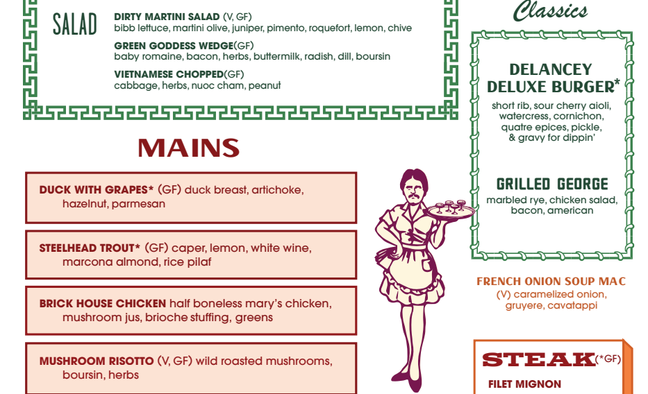 Granted, there are familiar dishes given a novel spin..."Disco Fries" ($22), "French Onion Soup Mac" ($22), and "Delancy Deluxe Burger" ($36). But they're few and far between, lost among exotic fare like "Turf Tartare" "Mussels and Fries", and "Fried Olives" ($14). Nope nope nope...sorry, but I'm not feeling anything "disco diner" from this. Bring me Donna Summer and a Chef salad, please.