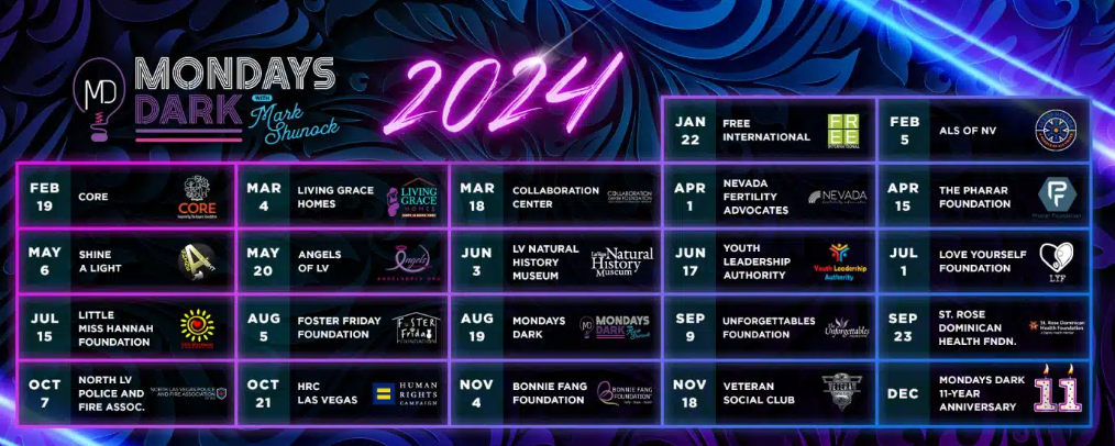 "The mission of Mondays Dark is to raise $10K in 90 minutes. The $20 variety show has become one of the hottest tickets in town and the list of charities waiting to partner with Mondays Dark continues to grow. Partnering with over 180 local organizations, Mondays Dark has raised over 1.8 million dollars and every penny has stayed here in Las Vegas."