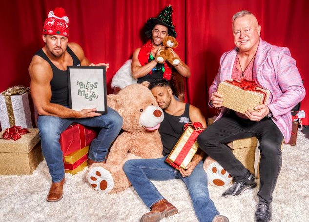 VEGAS 411 was on hand when a trio of hunks from THUNDER FROM DOWN UNDER met at The Space to promote HOLLY JOLLY Photo Sessions. Acrobat/trainer Simon Ata, emcee/deejay Kurt Joseph, and towering Alex Champtaloup hammed it up and had a terrific time. The guys even pulled me in front of the camera for a few shots before recording a clip for our readers: