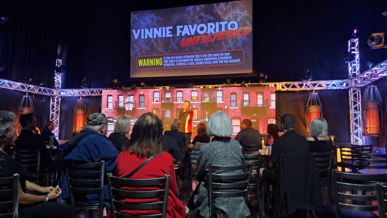 After a stirring encounter with the dead, we "crossed over" from NOTORIETY's "Chandelier Room" to the "Robin Leach Theater". There, we grabbed the last few minutes of VINNIE FAVORITO: UNFILTERED. The insult comic, who's somehow as adorable as he is abrasive, is always a great time.