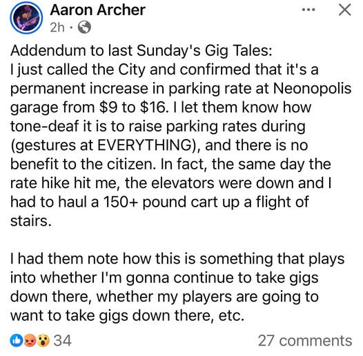 The garage is not owned by Neonopolis, it's owned and operated by the city...the $16 is for 24 hours so no one will ever pay that. The most you will pay for a normal show is $7. All talent who perform there are validated by Notoriety. No excuses, the elevators going down has been an issue sometimes but not often, but there are two and escalators if that happens. I'm not a fan of the fees but have zero control.... fortunately, when all is working properly, which is 97% of the time, it is very easy to go straight up to the third floor and walk 30 steps to the front door. Unfortunately, it's Las Vegas and as they do on the strip, but three times the cost they all need to make a buck.