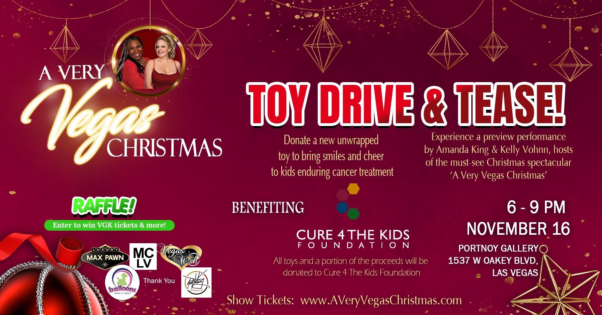 "We are having a Toy Drive & Raffle to benefit Cure 4 The Kids Foundation which supports children and families through the cancer treatment process. We have 5 locations around town, including Prosecco, where people can drop off a toy. For those that do, if they scan the QR code on the poster, they will get $5 off their ticket. OR if they bring a toy to the show and buy tickets at the door, they will get $5 off (or a free raffle ticket if they've already purchased their tickets). A raffle will be drawn on Dec. 4 during the show. Two Jack Daniels lounge VGK tickets and other great prizes are available. "