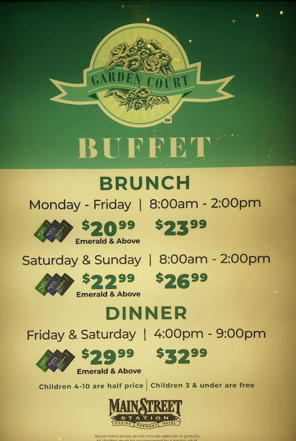 If you visit the official website for MAIN STREET STATION Casino Brewery Hotel, you'll barely see a mention of Garden Court Buffet. There's one single photograph, a line that says "Open for brunch/limited dinner" and that's it. No list of themed dinners, pricing structure, or specific hours. There's really nothing to entice you into visiting.