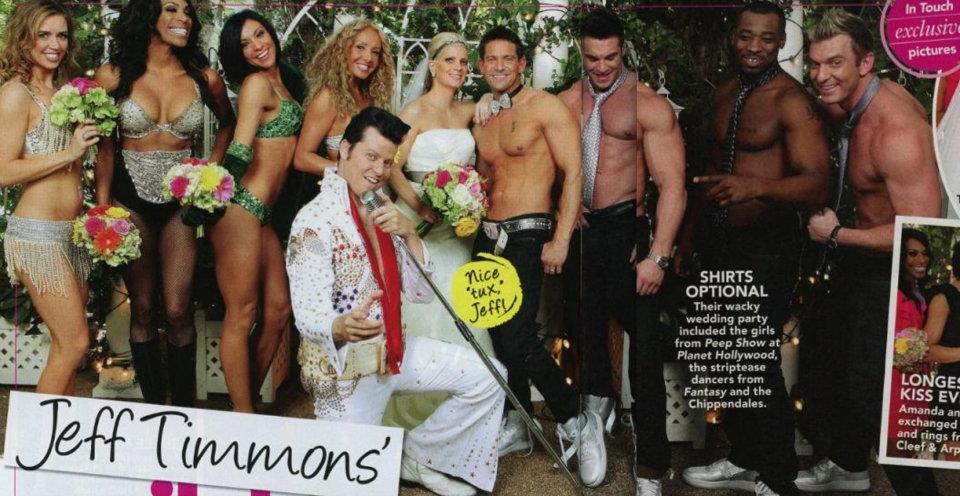Nothing is too outrageous when it comes to Sin City weddings. 98 Degrees singer (and Las Vegas resident) Jeff Timmons documented his 2011 marriage with an eye-popping spread for In Touch Weekly magazine. The groom was shirtless, flanked by members of Chippendales, while his new wife Amanda held court with bikini-clad cast members of FANTASY and Planet Hollywood's PEEP SHOW. Even "Elvis" made a cameo appearance at the unique event.