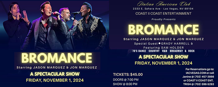 Now the two gentlemen present their showcase BROMANCE at Italian American Club on November 1st. This must-see teaming will include special guests Sam Holder and Grady Harrell. Tickets are $45 and can be ordered here or by at phone 702-457-3866. Showtime is 7 pm. Italian American Club is located at 2333 East Sahara Avenue.