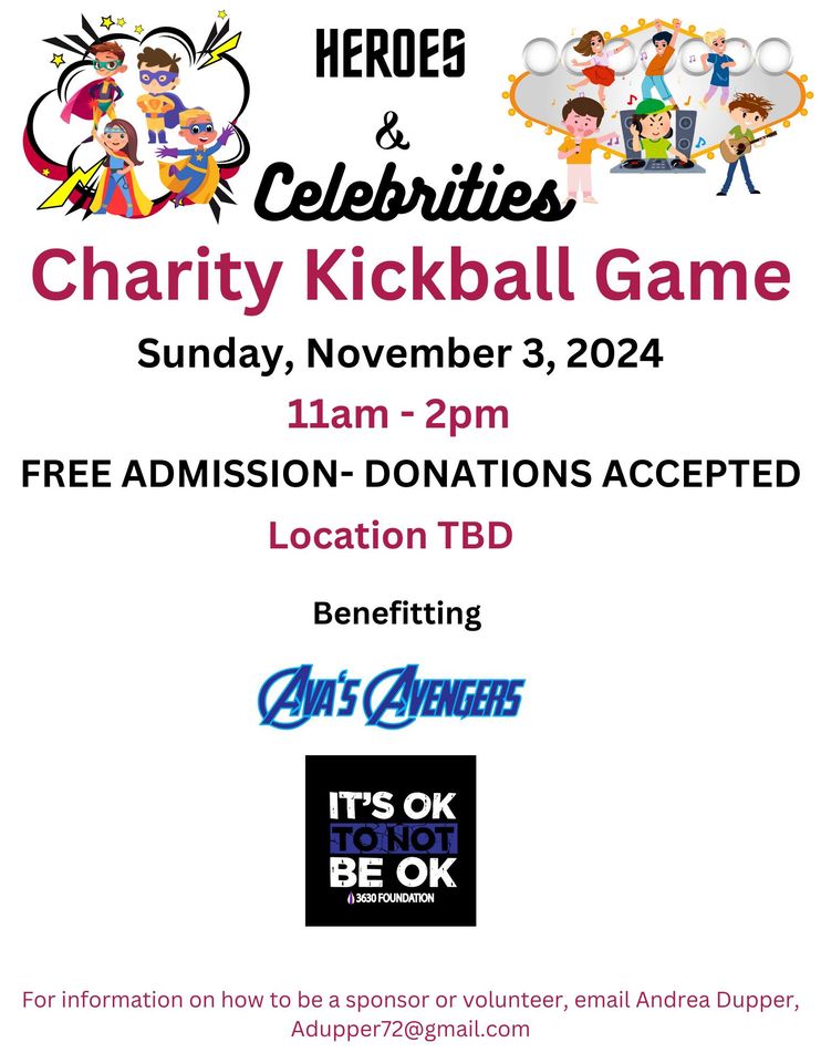 Come watch your favorite local celebrities kick some balls around for a good cause! Ava's Avengers and the 3630 Foundation are the beneficiaries of this charity kickball game. Admission is FREE! There will be food trucks, games, chances to win raffle prizes, and even a 50/50 raffle!