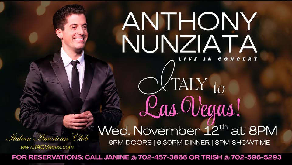 Tickets for ANTHONY NUNZIATA: ITALY TO LAS VEGAS are $70 and include IAC's famous Italian buffet dinner. Dinner starts at 6:30 pm with curtain time at 8 pm. Make your reservations here or by calling Janine at 702-457-2866. The Italian American Club is located at 2333 East Sahara Avenue.