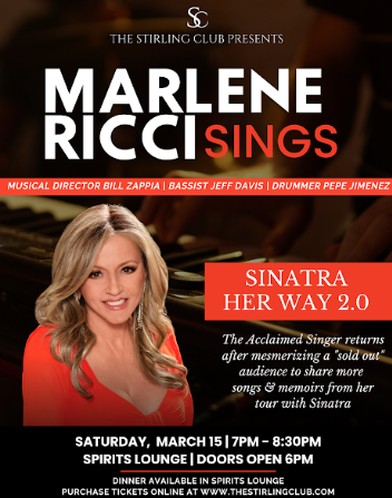 Presented by The Stirling Club, SINATRA HER WAY 2.0 takes audiences on a second journey through the Frank Sinatra songbook as only his protege Marlene Ricci can perform it.