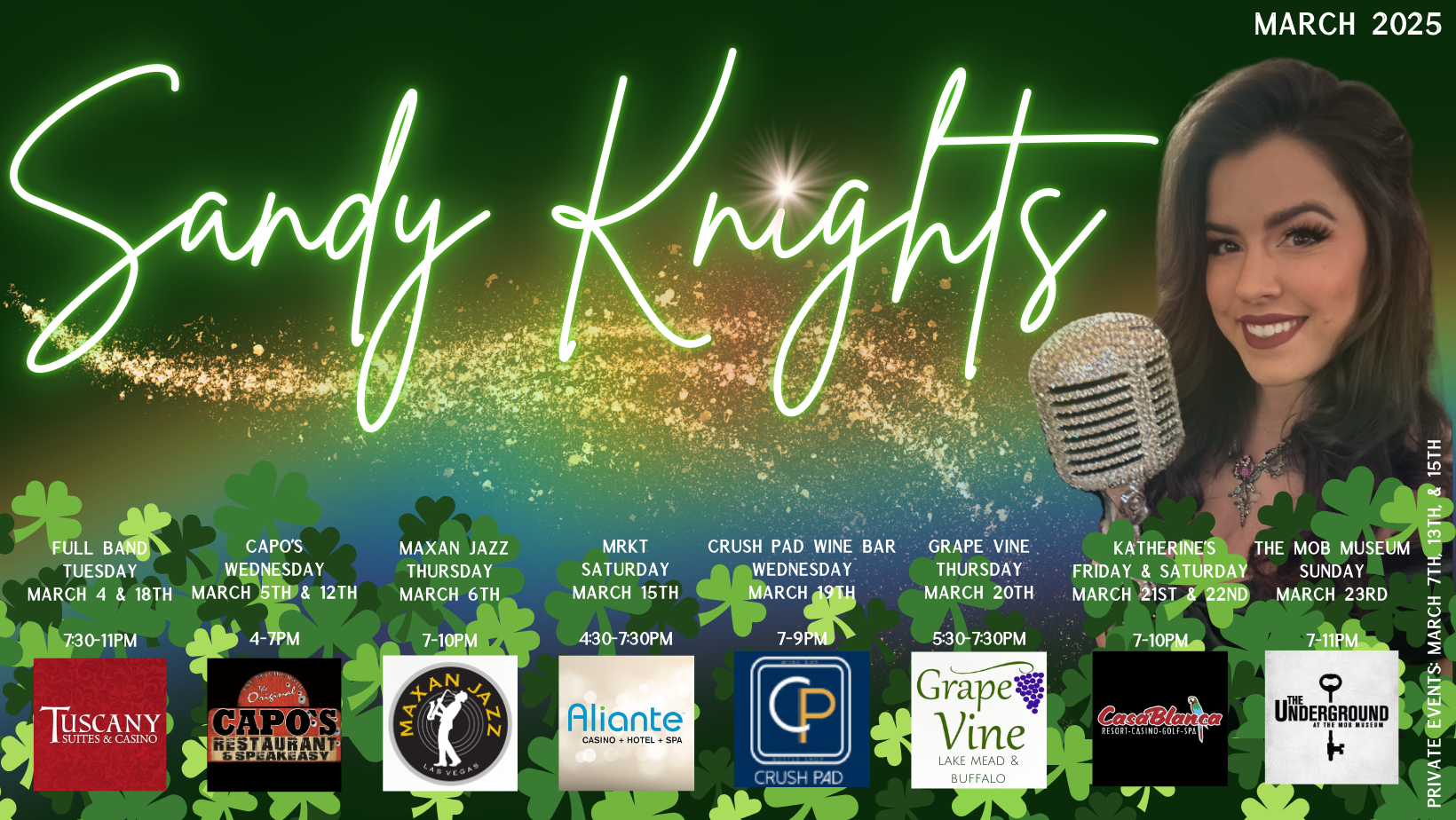 You may remember beautiful Sandy Knights from this VEGAS 411 profile piece. The hard-working vocalist is drenching the Vegas Valley in her magic. Since Sandy is so busy, we're sharing a recent graphic from her Facebook page. Seek out this wonderful artist and have a great time.