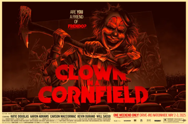 Drive-in exclusive screenings were held Friday and Saturday before the film opens nationwide on May 9th (get locations and showtimes here). Ticket buyers received a specially commissioned full-size poster. Author Adam Cesare was present, along with "Frendo the Clown". They sent this greeting to VEGAS 411 readers: