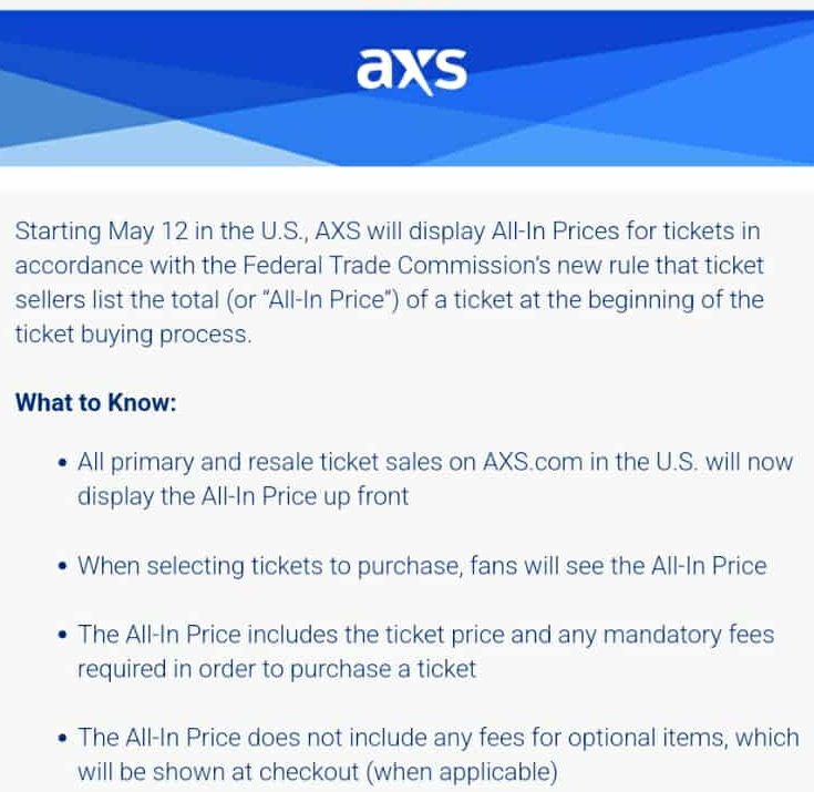 The same concept now applies when purchasing show tickets from outlets like Ticketmaster and AXS. The price shown now IS the actual price, except for state and local taxes. No more piling fee after fee at the checkout screen. It's OVER!!!