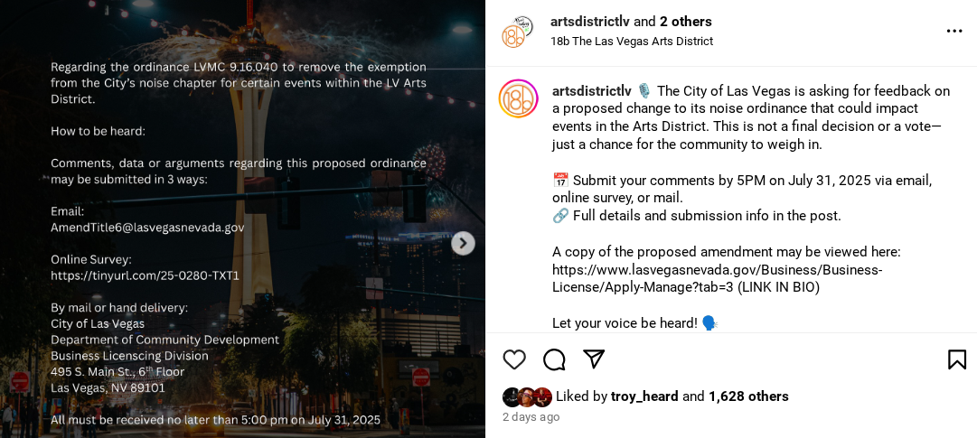 Hello Rockstars!This is a repost from DTLV Arts District, but also an incredibly important issue that affects all the amazing concerts and venues going on in the DTLV area, which is the heart of our music community! We do have a voice, and it deserves to be heard! Please let the City of Las Vegas know how we feel! I have included a link to the proposed amendment: