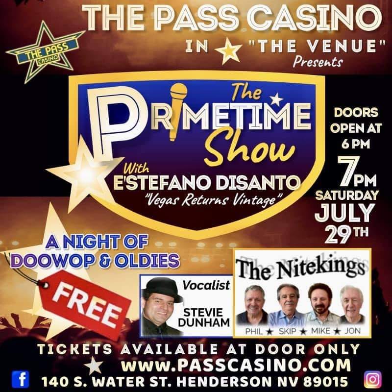 Hosted by E'Stefano DiSanto, "The Pass By" has been such a success that it's spawned a prequel of sorts. The Primetime Show will also run at The Pass Casino at 7 pm on Saturdays. DiSanto describes it as "Vegas Returns Vintage". The premiere takes place on July 29th and will double as a birthday celebration for Stevie Dunham. For that night only, admission will be free to guests enrolled in the casino's Player's Junction Card program.