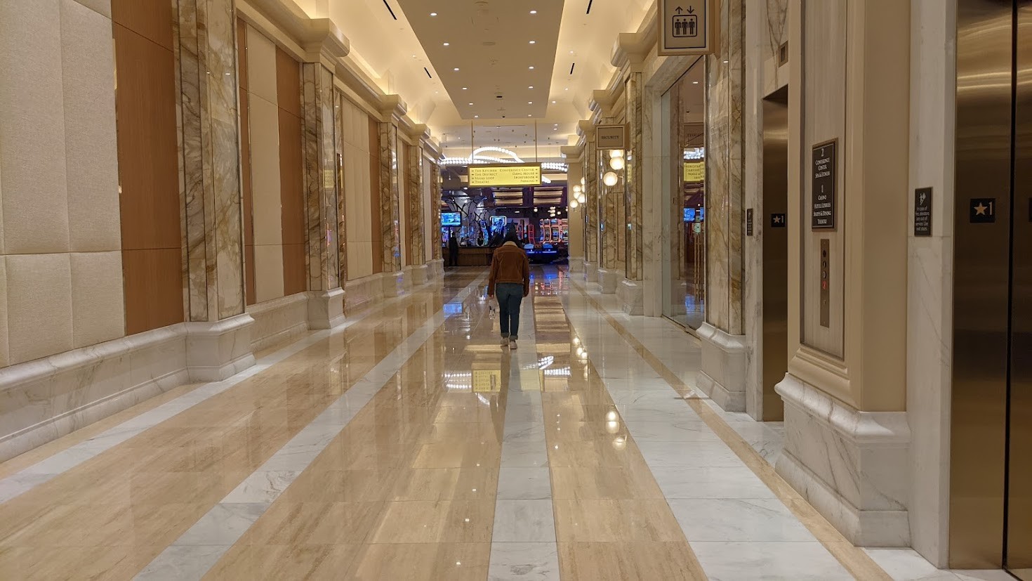 If you arrive by car, know that there are two parking garages. The one on the south end of the property (nearest Trump Tower) is primarily intended for short-term visitors. The second one services the hotel itself and is located on the northwest corner of the property. Whichever you choose, know that you will be walking a very long distance. The advantage of the hotel garage is that the journey is indoors, albeit through one long corridor after another. You'll enter the building near the showroom, take a left when you encounter the casino, stroll past the unattended security desk, then continue on your trek.