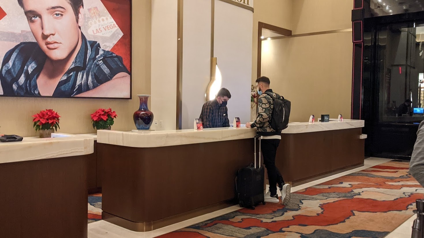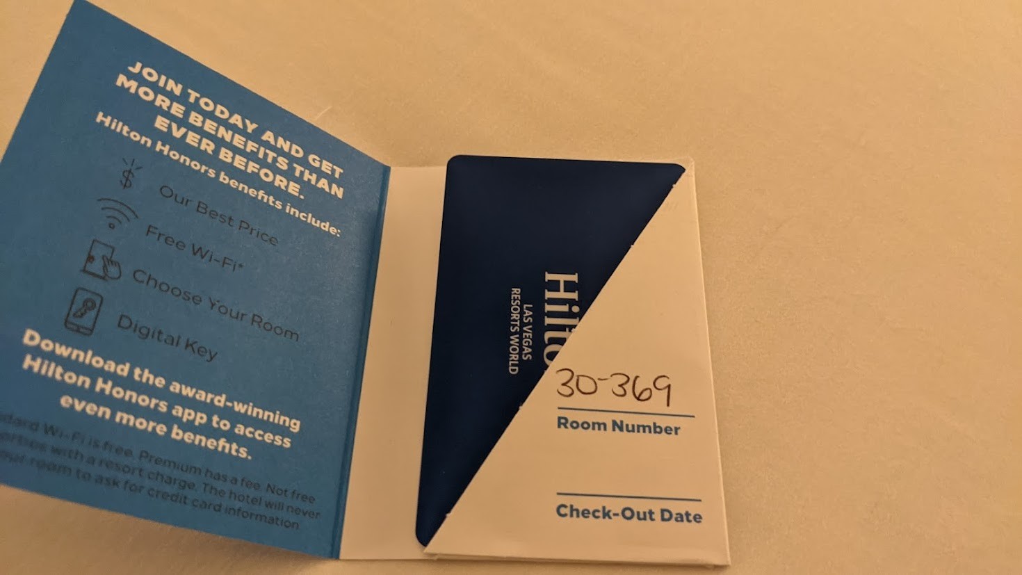My reservation called for a Deluxe Room, which is fancy-speak for "bottom tier". These come in three choices of regular, "City View" and "Strip view", with slight variations in price. The agent informed me that my option was currently sold out, so she upgraded me to City View #30-369, then directed me to the elevator banks. There was no discussion of amenities, workout facilities, checkout time, or dining suggestions. Instead, she cautioned me against using the casino garage if I'd come by car (too late!). "It's not marked very well", she confided.