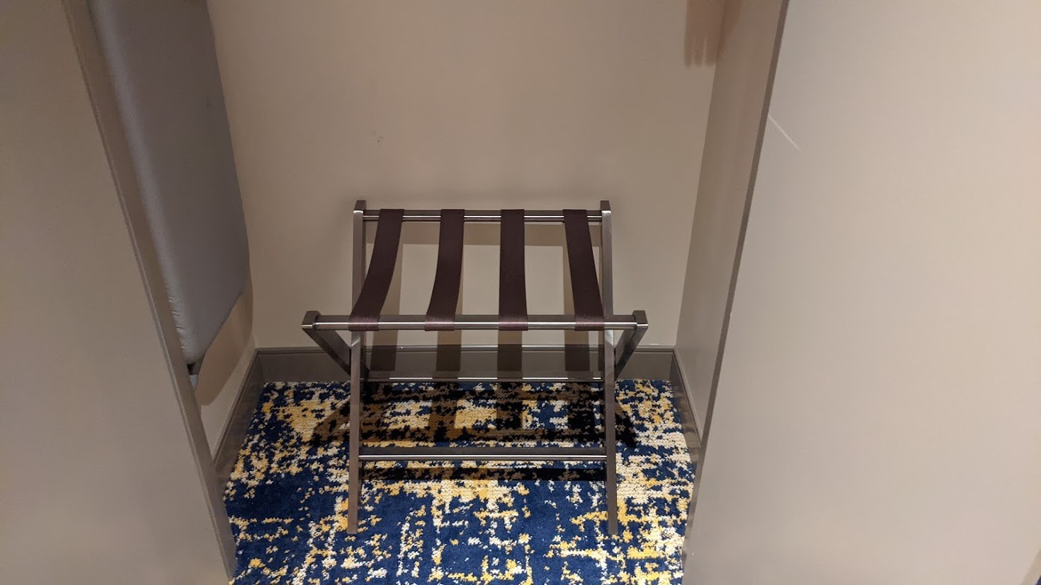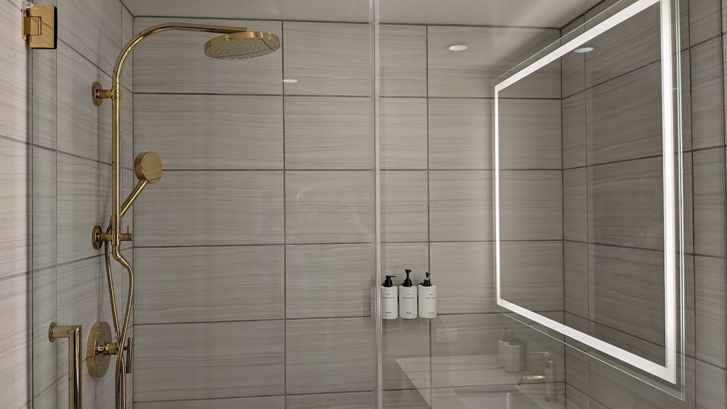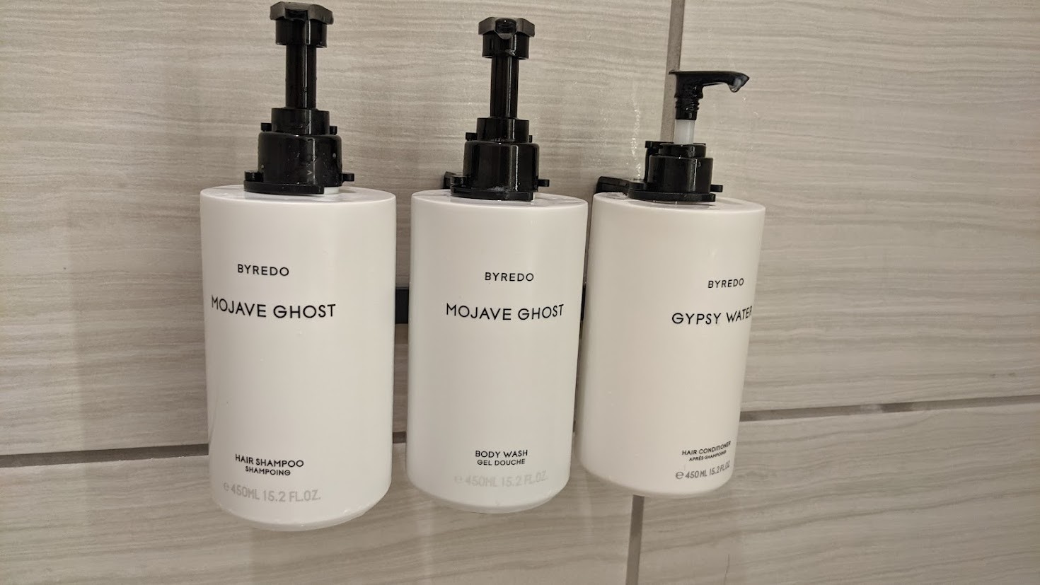 There was a small table and upholstered chair against the window. Inside the closet were an iron, ironing board, and a single luggage rack. The bathroom is also basic but modern, with a walk-in shower and pump dispensers for lotion and cleansers. Unlike other Vegas hotels in which dispenser bottles are secured in locked holders to ward off pranksters, these ones can be tampered with. So use the provided toiletries at your own risk.