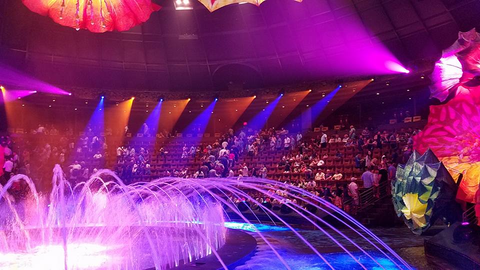 LE REVE was an aquatic spectacular whose centerpiece was a 27-foot-deep pool. With the water removed, the remaining pit has been converted into a massive lazy susan turntable. The flat stage-level surface has an outer ring and a disc at its center. Between them is a collection of crescent-shaped "pie sections".
