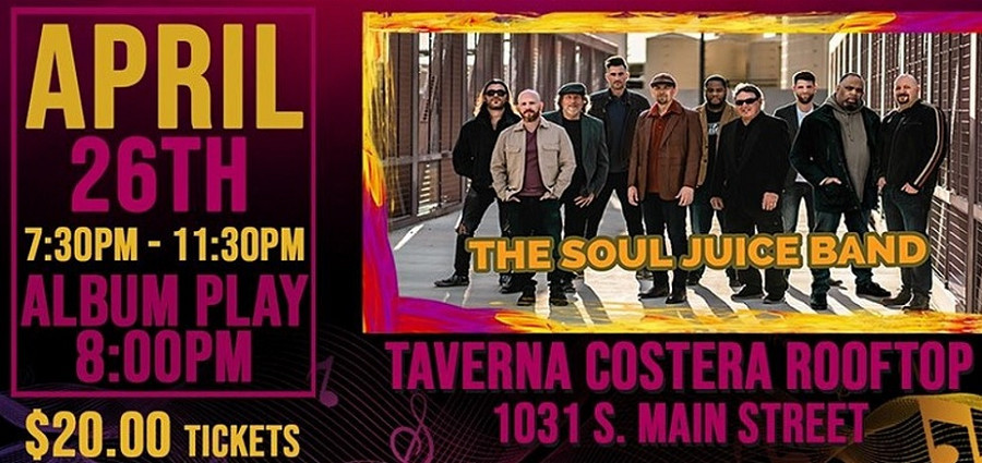 Be one of the first to hear THE SOUL JUICE BAND's new album on April 26th at 7:30 pm. Tickets are $20 and include admission, hors d' oeuvres, cash bar, and a deejay. Taverna Costera is located at 1031 S. Main Street near the new Todd English Hotel. Click here to reserve your admission. Follow this link to listen to The Soul Juice Band on Apple Music and Spotify.