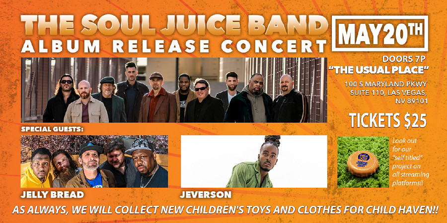 There will be even more opportunities to see and hear The Soul Juice Band in the weeks and months ahead. On May 20th, they'll be holding a full-fledged album release concert inside THE USUAL PLACE at 100 S. Maryland Parkway. Special guests Jelly Bread and Jeverson will join them. Tickets are only $25, and a portion of the proceeds will benefit Child Haven through KIDZ UPLIFTING KIDZ FOUNDATION. Clothing and toy donations for the charity will be accepted at the door. Click HERE to reserve your seats.