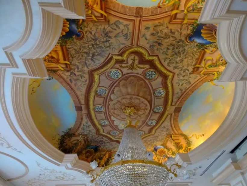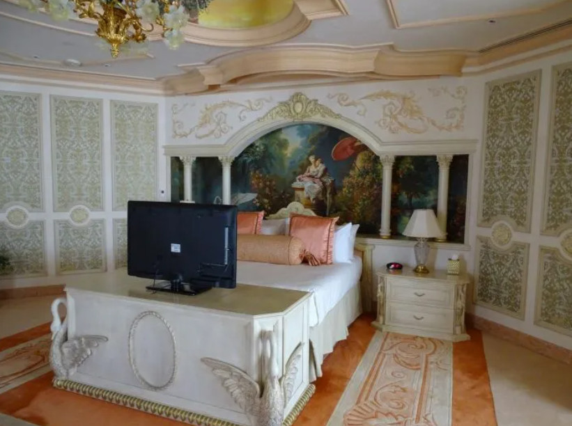 Impressive columns, hand-carved furniture, domed ceilings, and plenty of genuine gold accents over a peaches-and-cream palette make it easy for you to pretend that you re in a French castle.
