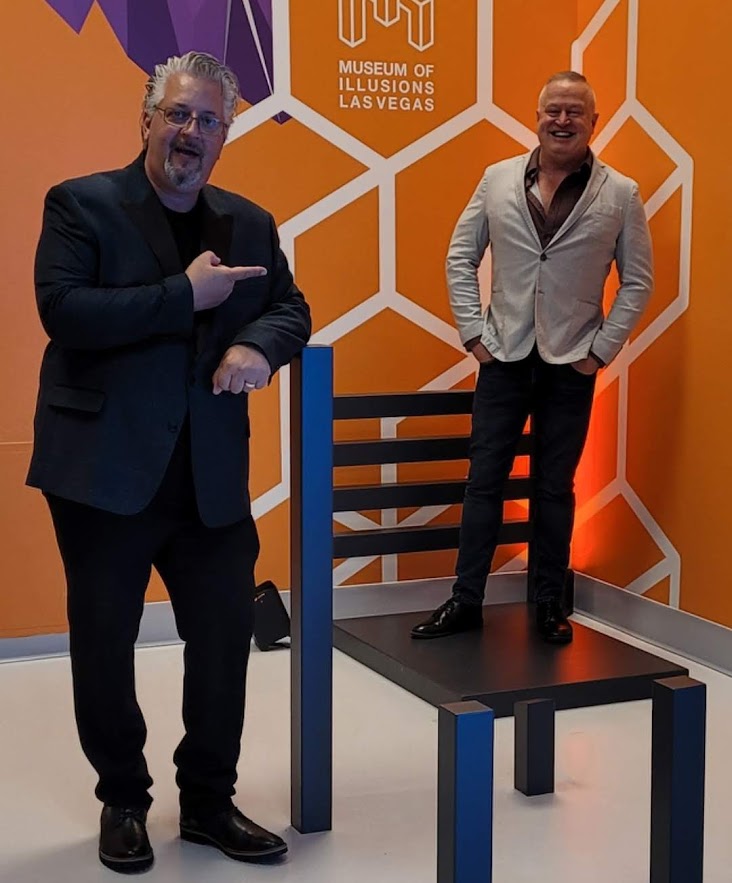 My guest for the evening was Aron Elekes of Go Live Vegas, a multi-media radio station, podcast studio, and live-streaming service company. Elekes was game to pose for photos at some of the eighty-plus exhibits. Cleverly designed displays allow you to alter your perspective while taking amusing yet puzzling photographs.