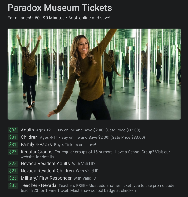 "Welcome to the Paradox Museum on the iconic Las Vegas Strip! Immerse yourself in a world of mind-bending exhibits that challenge reality and perception. Get ready to question the very fabric of existence. Come and experience the extraordinary!"